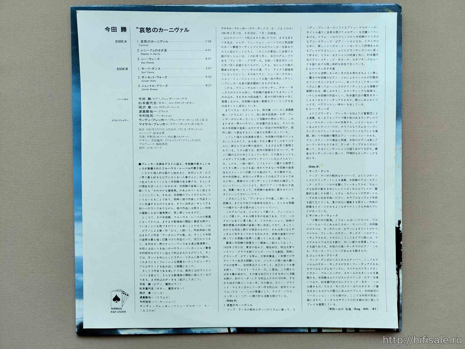 Mixed at Sound Inn, Tokyo July 1st, 1981.
